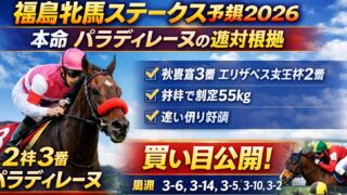 2026重賞予想 福島牝馬ステークス予想2026 本命パラディレーヌの連対根拠 2026年4月19日福島牝馬ステークスの予想。最新の枠順、追い切り、馬場見込み、展開を整理し、本命パラディレーヌ、対抗ミッキーゴージャス、単穴ジョイフルニュースまで連対目線で詳しく解説。買い目例付き。 2026.04.17 2026重賞予想4月