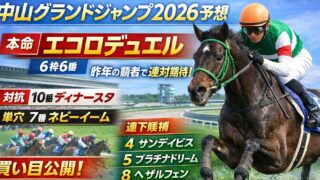2026重賞予想 中山グランドジャンプ2026予想 本命エコロデュエルで連対狙いの最終結論 中山グランドジャンプ2026の最新予想。出走馬10頭の枠順、良馬場見込み、隊列想定、最終追い切りを整理し、本命エコロデュエル、対抗ディナースタ、単穴ネビーイーム、連下3頭と買い目まで初心者にも分かりやすく解説。 2026.04.17 2026重賞予想4月