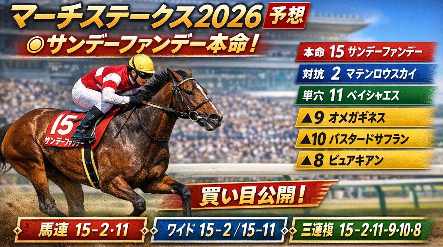- 本命: 5枠15番 サンデーファンデー(重賞2着好走の実績、仕上がり良好)
