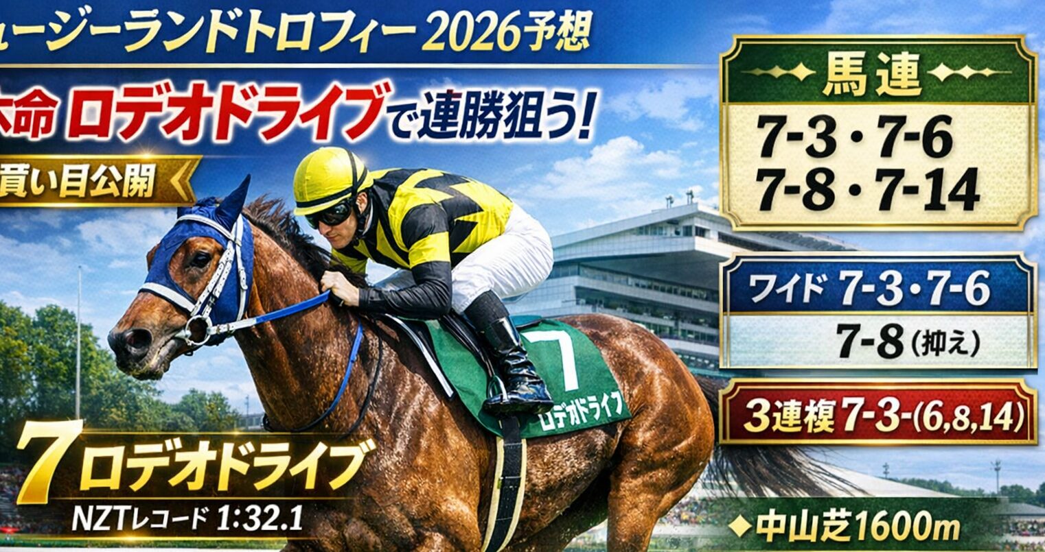 - 本命:⑦ロデオドライブ(前走中山千六連勝中、L.ジーニュージーランドTレコード保持)