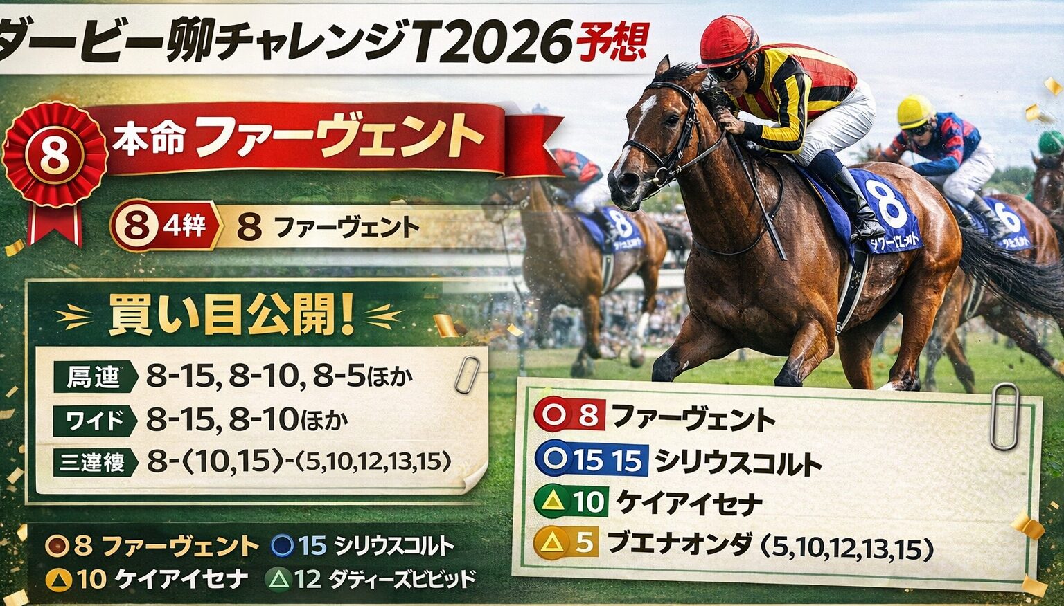 ケイアイセナ、エエヤン、メタルスピード、ダディーズビビッドなど前に行きたい馬が複数。前半から流れやすく、過去傾向でもダービー卿CTは瞬発戦より平坦戦・消耗戦が多い。差しも届くが、後方一気よりは中団差しがハマりやすいと見たい。